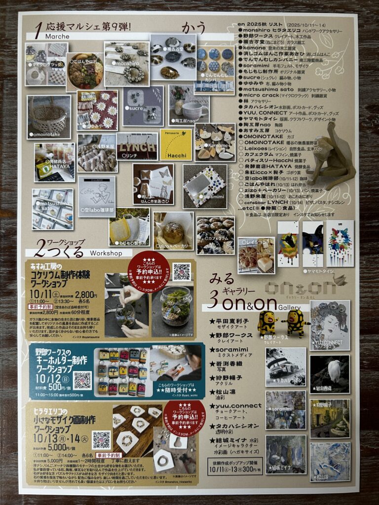 こちらのイベントでは、マルシェやギャラリー展示など、芸術の秋にピッタリな催しがたくさんあります。ワークショップは事前予約で定員になり次第締め切りますのでお早めにご予約ください。